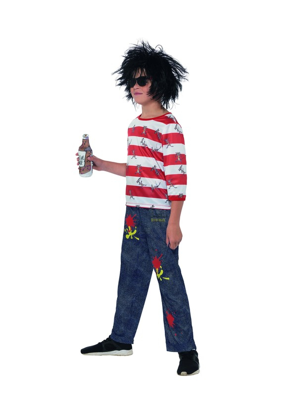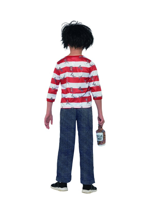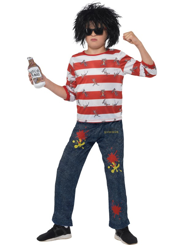 David Walliams Deluxe Ratburger Kostuum, bestaande uit een rood/wit shirt, broek, pruik, bril en een special sauce accessoire met geluid.