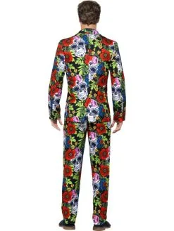 Day of the Dead Net Herenpak Halloween. Inbegrepen is de all-over print broek, het colbert jasje en de stropdas. Geen saaie pakken meer naar je feestjes of je werk? Met onze nieuwe hippe geprinte herenpakken valt u gegarandeerd op. De pakken vallen redelijk groot uit, bij twijfel adviseren wij de kleinere maat te kiezen Wij verkopen ook het bijpassende dames kostuum.