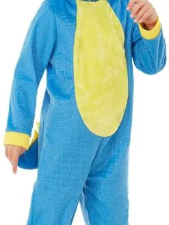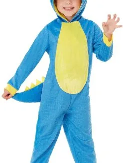 Leuke Dinosaurus Onesie Kostuum voor peuters, bestaande uit de blauw met gele hooded jumpsuit met staart.