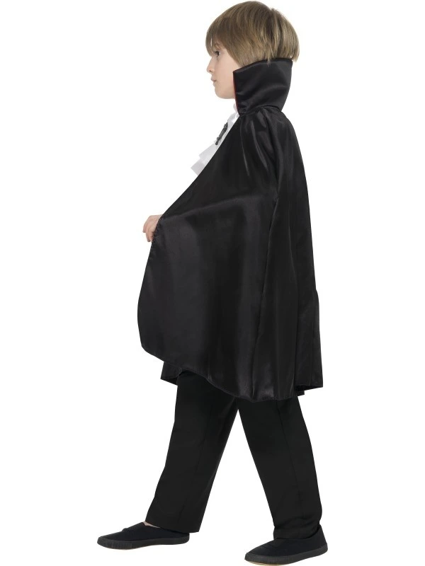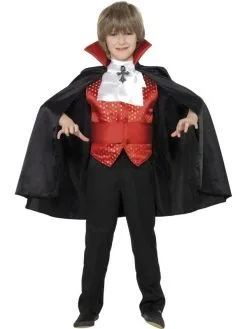 Dracula Jongensverkleedkleding. Inbegrepen is de cape, het rode gedetailleerde shirt en het witte boordje. Draag op een zwarte broek en dit mooie kostuum is compleet.