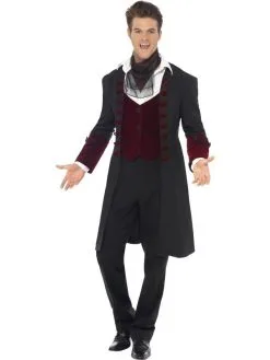 Fever Gothic Vampire Vampieren Kostuum Heren Halloween Kostuum. Inbegrepen is de zwarte jas, de spencer en de cravate. Draag het met een zwarte broek en je outfit is compleet. We verkopen vampieren schmink en tanden los.Â