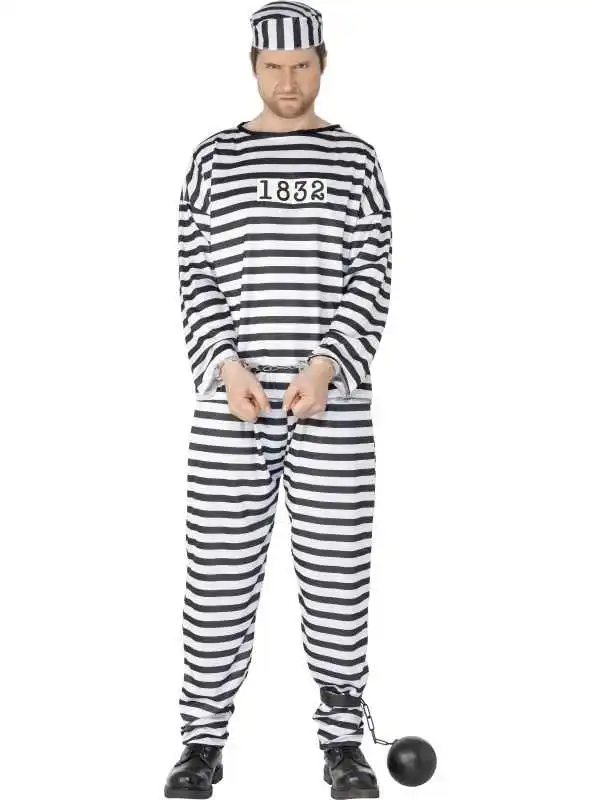 Gevangenen Boeven Heren Verkleedkleding. Inbegrepen is het gestreepte shirt met nummer, de gestreepte broek en pet. Compleet verkleedkleding.