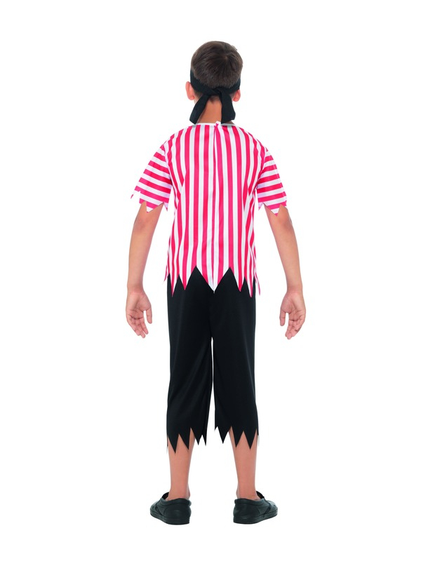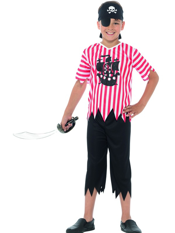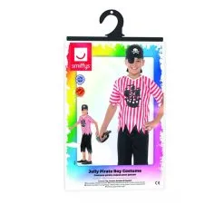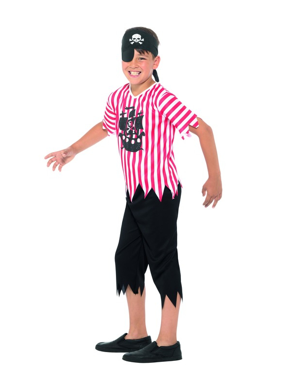 Leuk Jolly Piraten Kostuum, bestaande uit de rood/witte top met broek, bandana en ooglapje. Je bent in één keer klaar voor Carnaval of ander themafeestje.