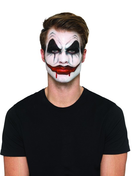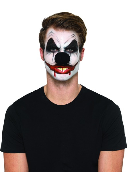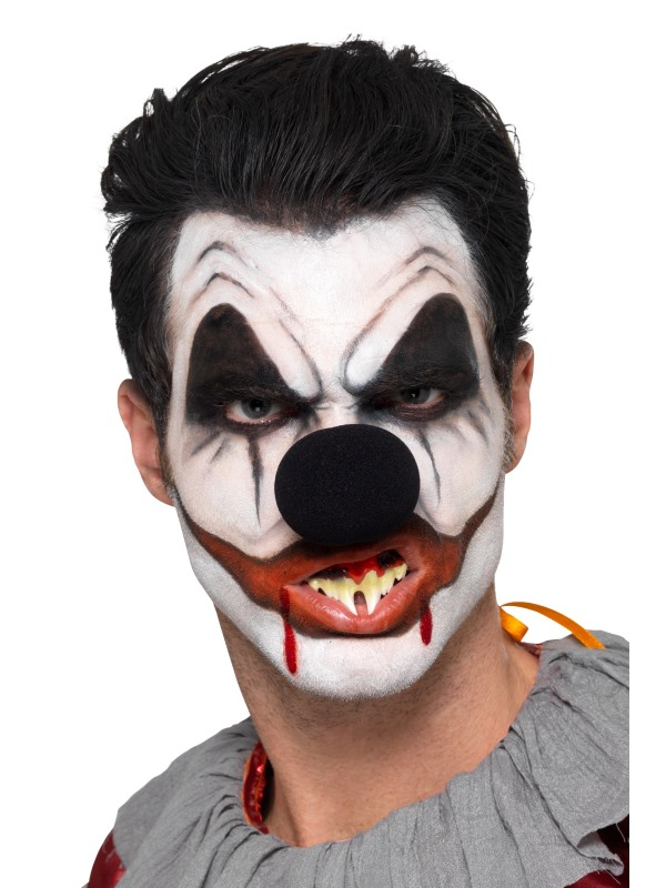 Killer Clown Cosmetic Kit, bestaande uit 3 Kleuren schmink op waterbasis, Blood, Neus, Tanden en een Spons en borstel om de schmink aan te brengen.