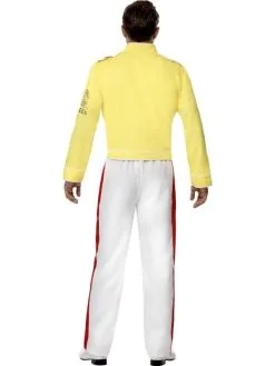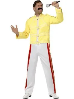 Queen Freddie Mercury Kostuum, bestaande uit het gele jasje met broek. Maak de look compleet bijpassende accessoires en je bent klaar voor Carnaval of Themafeestje.