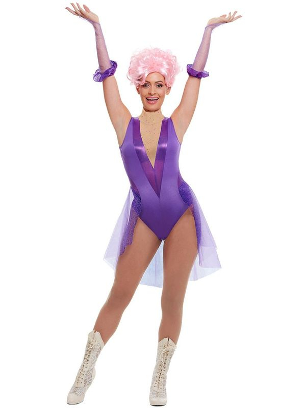 Trapeze Artist Kostuum bestaande uit de paarse Bodysuit en handschoenen. Maak de look compleet met onze Trapeze Artist Pruik.
