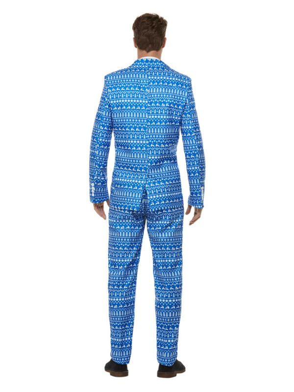 Wrapping Paper Pak Kostuum, bestaande uit het blauwe jasje met broek en stropdas met all-over inpakpapier print. Leuk voor een fout feestje tijdens de feestdagen. Bekijk hier al onze Herenpakken.