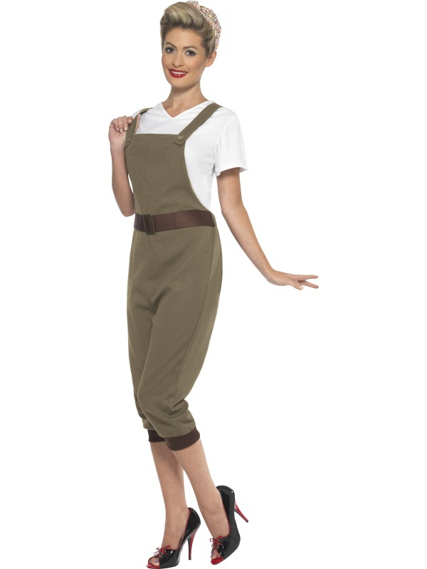 WW2 Land Girl Kostuum – land girl kostuum, inclusief witte top met V-hals en korte mouwen, legergroen tuinpak met driekwart pijpen en bruine riem met gouden gesp en haarband. We verkopen nog veel meer WW2 kostuums in onze webshop!